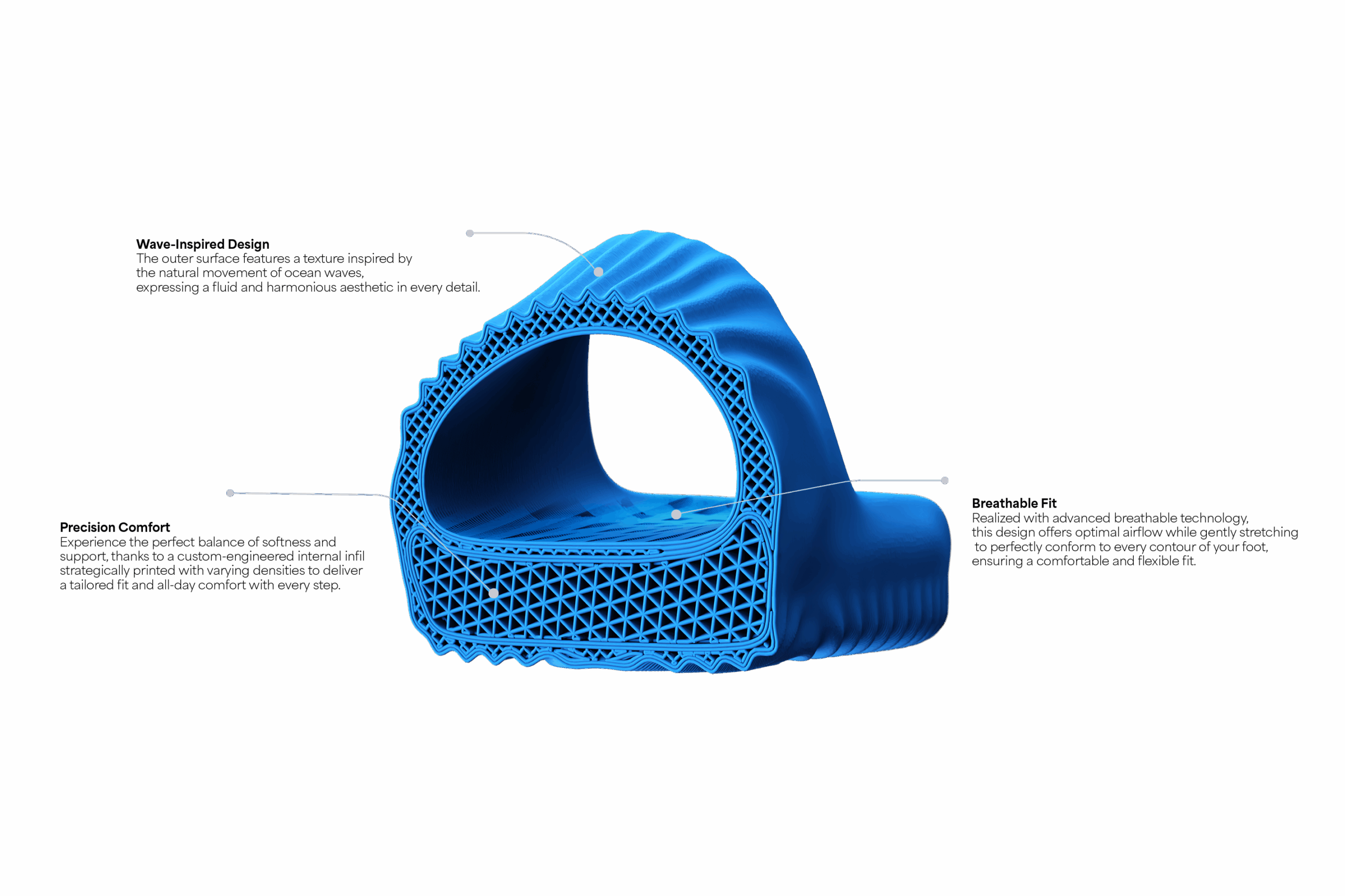Zellerfeld uses advanced 3D printing to craft seamless shoes in one piece using zellerFOAM®, a custom TPU blend. The interior features a parametric infill, where algorithms control density variations for targeted softness and support.